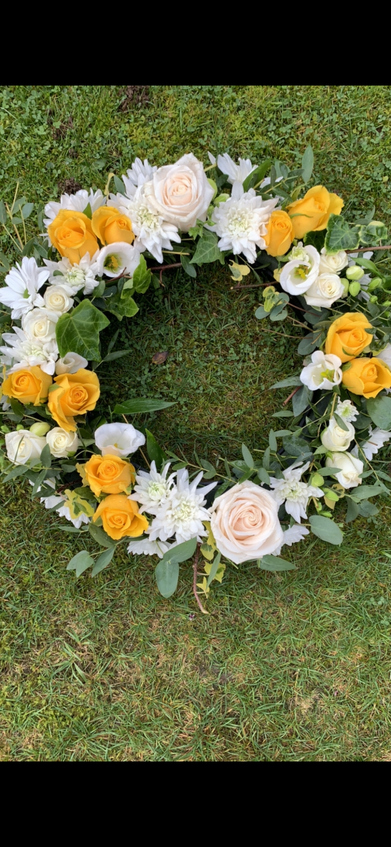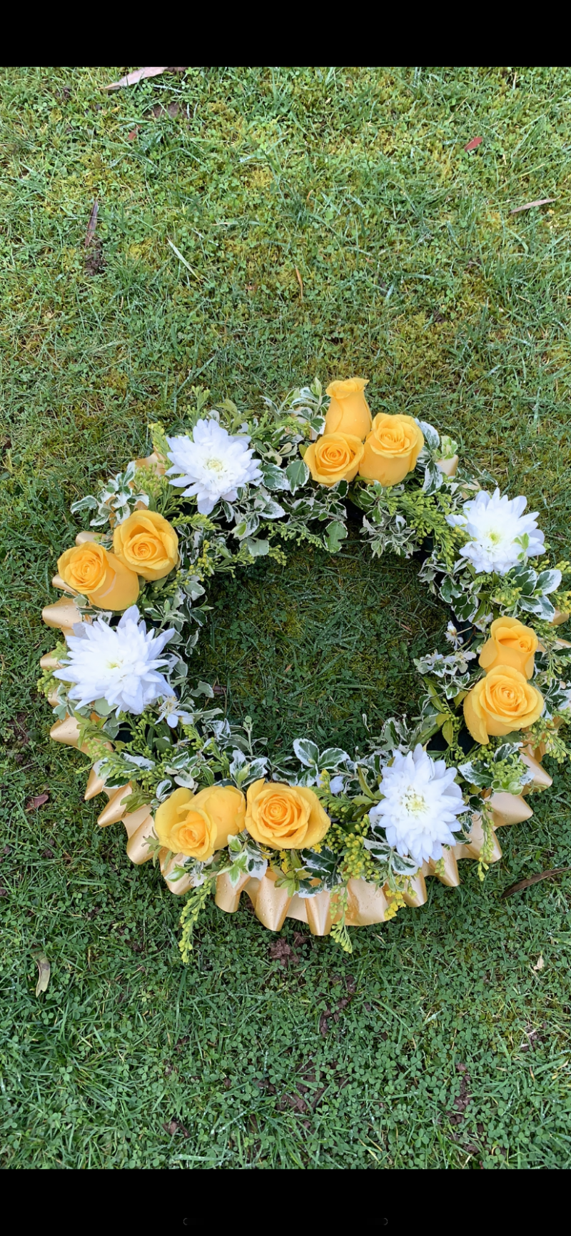 14inch circular fresh wreath. Lemon roses, white crysanthemum,solidago and ivy with a gold ribbon edging